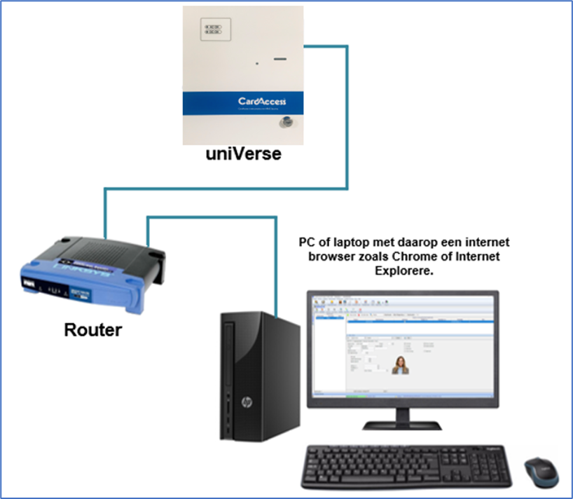 De uniVerse is ideaal geschikt om vlak bij de deur te monteren en indien we een PoE switch gebruiken dan behoeft er bij de deur geen 230Vac voedingsaansluiting aanwezig te zijn want zowel de lezer als het slot kan dan via de uniVerse worden gevoed.