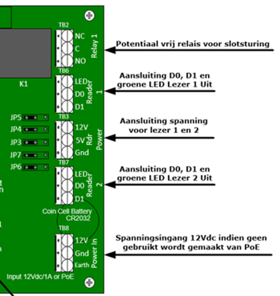 Lezer 1 Wiegand, Lezer 2 Wiegand en RS485 (Aperio beslagen via de Aperio HUB’s aangesloten via RS485) |