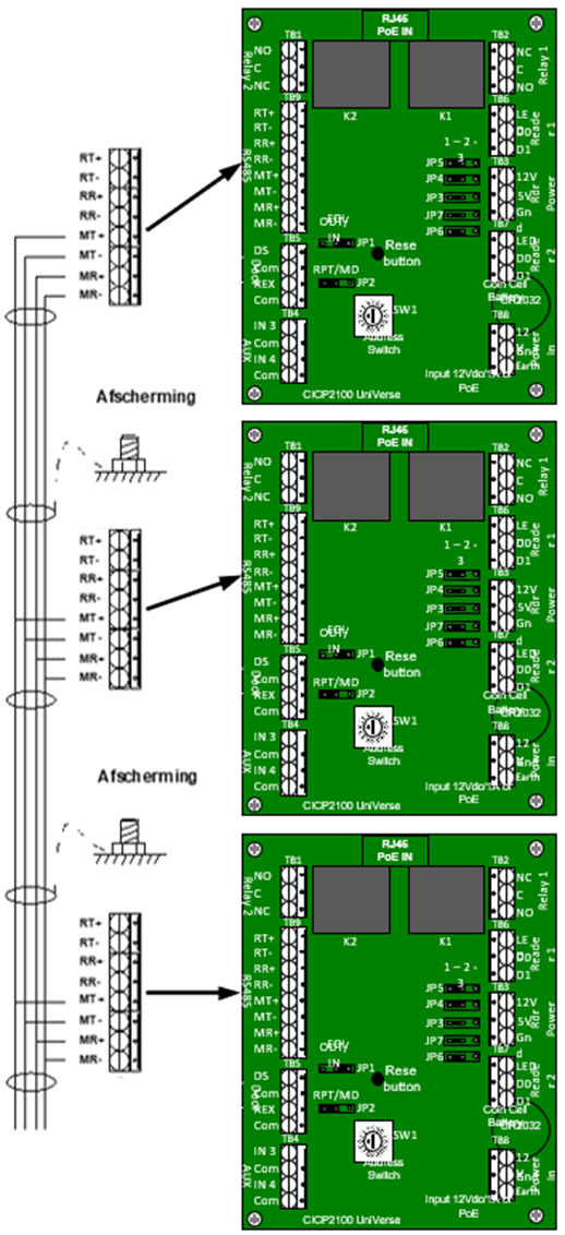 Op de uniVerse print zitten een aantal componenten die ervoor zorgen dat eventuele storingen van buitenaf naar aarde worden afgevoerd. Zorg er daarom voor dat de afscherming van de kabels altijd met het aardpunt worden verbonden.