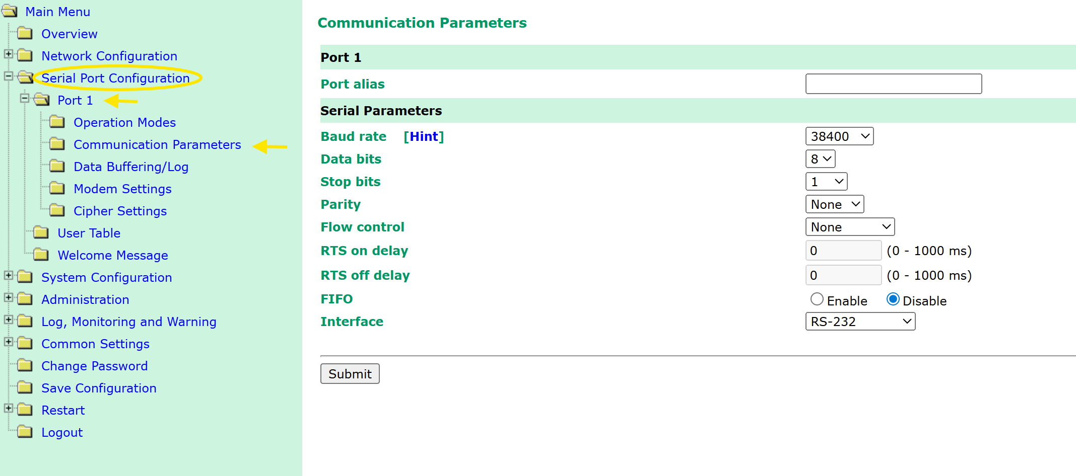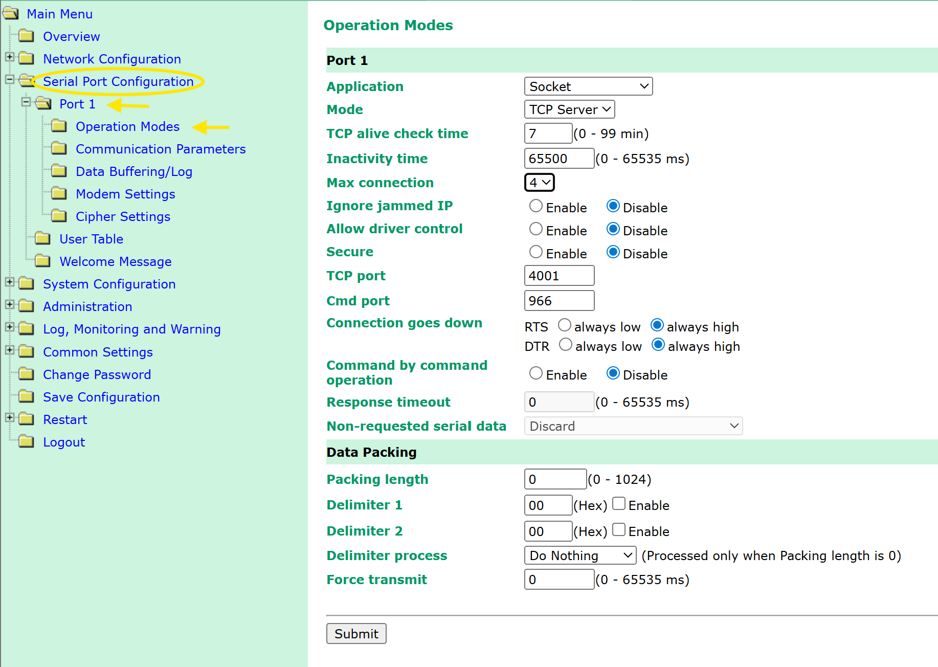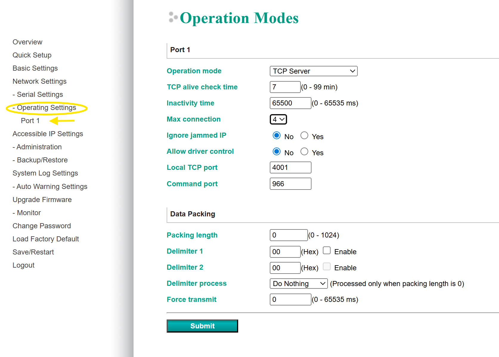 In de drie onderstaande afbeeldingen staan welke instellingen er met de Nport 5110 gemaakt moeten worden