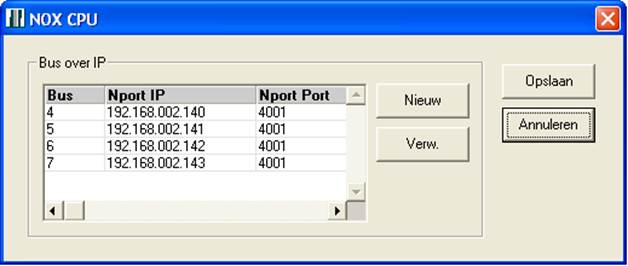 Wanneer u dit gedaan heeft ziet u hieronder het menu “Bus over IP”. Klik op nieuw en geef hier het IP adres (van de Nport) en de poort op. Het busnummer word automatisch toegewezen wanneer u meerdere IP bussen toevoegt.