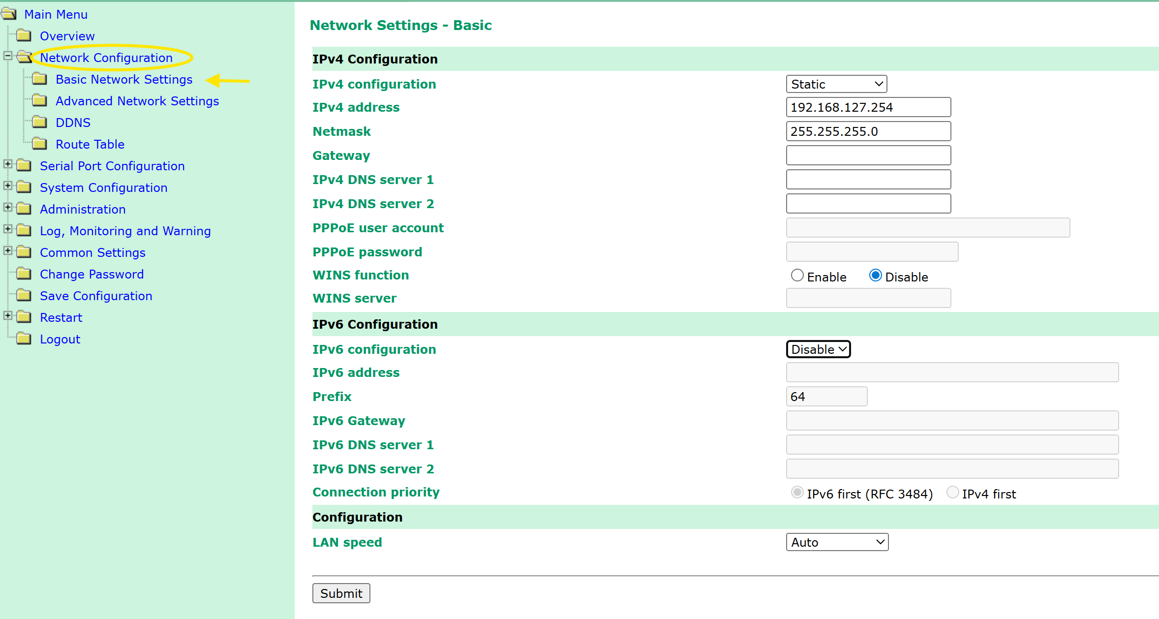 - Standaard of na een reset IP adres 192.168.127.254 en netmask 255.255.255.0.
