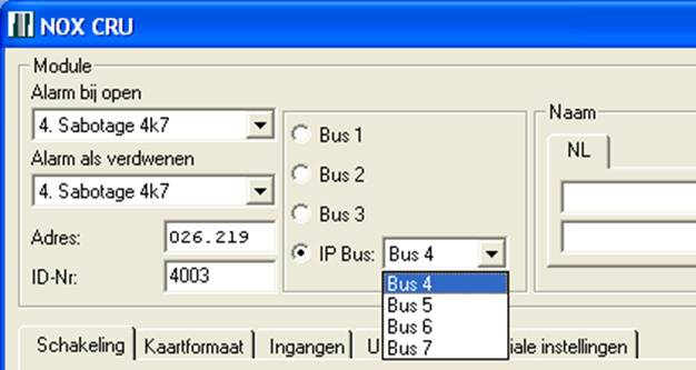 Op dit moment (als u de configuratie naar de centrale heeft verstuurd) heeft u extra bussen gecreëerd. Wanneer u een module heeft/aanmaakt ziet u de optie IP Bus. Als u dit selecteert kunt u de zojuist aangemaakt IP bussen selecteren.
