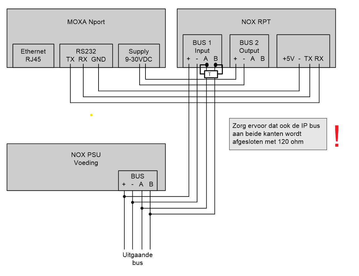 De NOX RPT kan aan het begin van de nieuwe IP-bus worden geplaatst, maar hij kan ook als bus deelnemer ergens in “het midden” zitten. Zorg ervoor dat de weerstanden dan op de juiste plek worden gemonteerd.