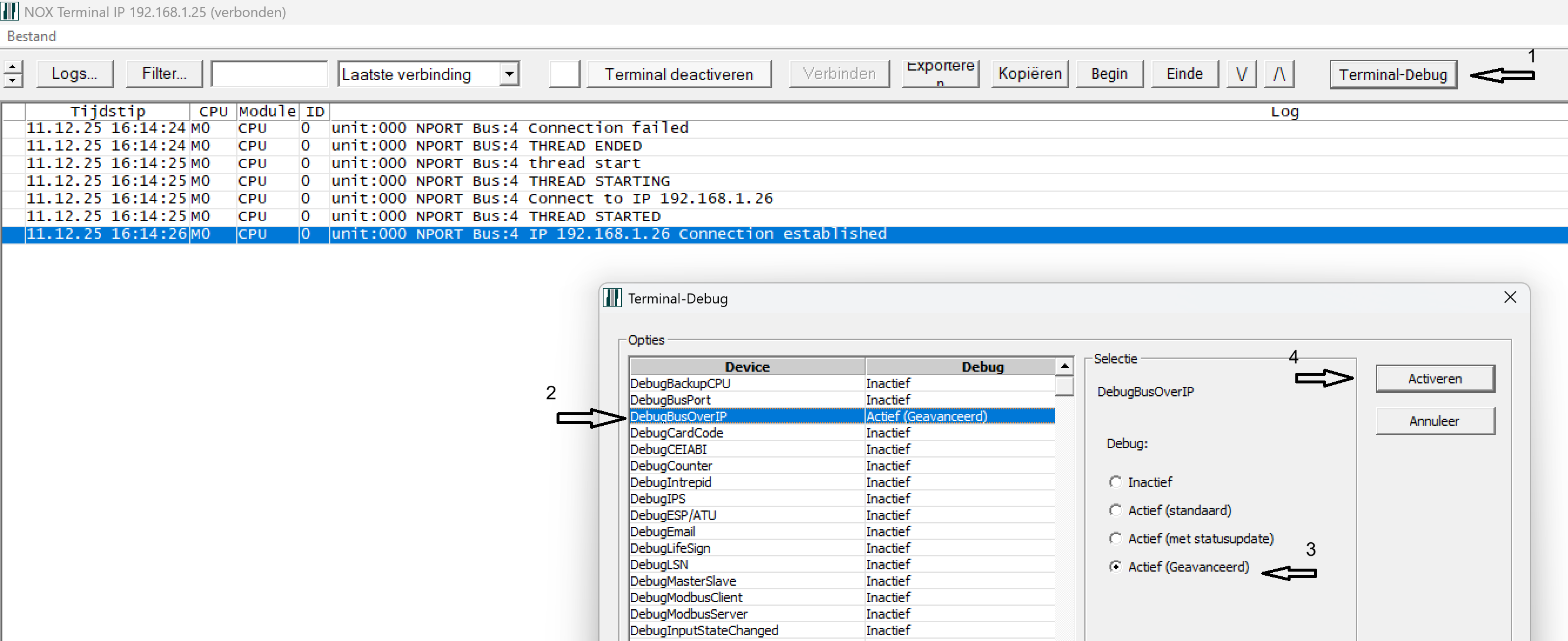 Via de terminal kan je de IP Bus Debuggen.