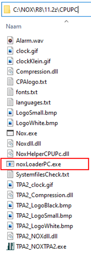 Binnen de map CPUPC bevinden zich alle bestanden welke door de virtuele CPU gebruikt worden. Door het bestand noxLoaderPC.exe te starten zal de virtuele NOX CPU worden gestart.