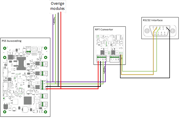Sluit de busrepeater aan zoals hieronder in het bedradingsschema is te zien. Omdat de busrepeater als converter wordt gebruikt wordt de “BUS – output” niet gebruikt maar wordt juist de “BUS - input” gebruikt om de uiteindelijke busmodules aan te sluiten.